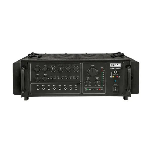 The Ahuja SSA-10000 is a flagship 1000-watt PA mixer amplifier built for demanding audio environments where clarity, power, and reliability are non-negotiable. Engineered for large-scale sound reinforcement, it’s ideal for auditoriums, religious venues, outdoor events, and institutional setups. This robust amplifier supports 100V line speaker systems and offers six mic inputs, two aux inputs, and one line input, giving users flexible connectivity for microphones, music sources, and external devices. It's built-in digital delay effect enhances vocal projection, while the bass, treble, and master volume controls allow precise tonal adjustments. The Ahuja SSA-10000 also features speaker zone selectors, AC/DC operation, and thermal/short circuit protection—ensuring uninterrupted performance even in challenging conditions. With its durable metal chassis, intuitive front panel layout, and wide frequency response, this Ahuja amplifier delivers distortion-free audio with deep bass and crisp highs. Whether you're powering a public address system or managing a multi-speaker setup, the Ahuja SSA-10000 stands out as a reliable, high-output solution.