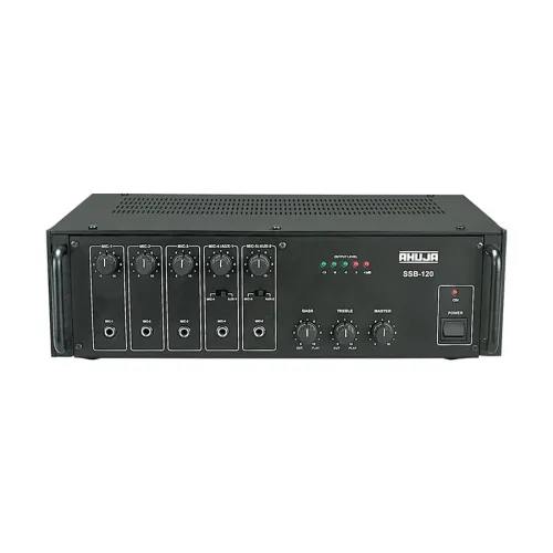 The Ahuja SSB-120 120 Watt PA Mixer Amplifier is a reliable audio powerhouse built for professional sound reinforcement across diverse venues. With a robust 120-watt RMS output, it effortlessly drives high-efficiency speakers to deliver crystal-clear audio in auditoriums, houses of worship, schools, and outdoor events. This mixer amplifier features 6 microphone inputs, 2 AUX inputs, and a line output, offering flexible connectivity for mics, musical instruments, and playback devices. It's built-in digital echo enhances vocal performance, making it ideal for live singing, speeches, and karaoke setups. The bass and treble tone controls allow precise sound shaping, while the instantaneous speaker short circuit protection ensures long-term durability. Designed with a compact metal chassis, the Ahuja SSB-120 is both portable and heat-resistant, perfect for continuous use in demanding environments. Whether you're setting up a public address system or upgrading your event gear, the Ahuja SSB-120 PA System stands out with its user-friendly interface, dependable performance, and value-driven price point, making it a top choice for audio professionals and institutions alike.
