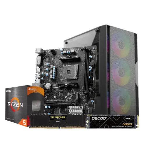 The AMD Ryzen 5 5600G Desktop PC is a well-assembled package made for multitaskers, gamers, and producers that will revolutionize your computing experience. The AMD Ryzen 5 5600G processor with Radeon Graphics, which provides unmatched speed and responsive performance, is at the center of it. There is no need for a separate GPU thanks to its integrated graphics, which guarantee fluid gameplay and creative tasks. This system offers a stable and effective foundation when paired with the dependable MSI B450M-A PRO MAX II AMD AM4 Motherboard. It supports PCIe components and high-speed memory, all of which are contained in a small form factor. The system is equipped with 8GB of Corsair Vengeance LPX DDR4 RAM, running at an impressive 3200MHz. This ensures lag-free multitasking and enhances overall system efficiency, perfectly complementing the Ryzen architecture. For storage, the OSCOO ON901 256GB PCIe NVMe M.2 SSD delivers lightning-fast boot times, quick game loading, and seamless file transfers, outperforming traditional SATA SSDs. All these powerful components are housed in the T-Wolf Phantom X4 RGB M-ATX Mid Tower Gaming Case With 200W PSU, a visually stunning addition to any setup. With customizable RGB lighting and a pre-installed 250W PSU, it combines style and functionality in one sleek package. This desktop PC is designed to meet all your needs, whether gaming, multitasking, or creative work. The powerful processor, high-speed RAM, and ultra-fast SSD deliver superior performance, while the motherboard ensures long-term upgradeability. Choose the AMD Ryzen 5 5600G Desktop PC and experience unmatched performance, style, and reliability for every task.