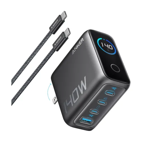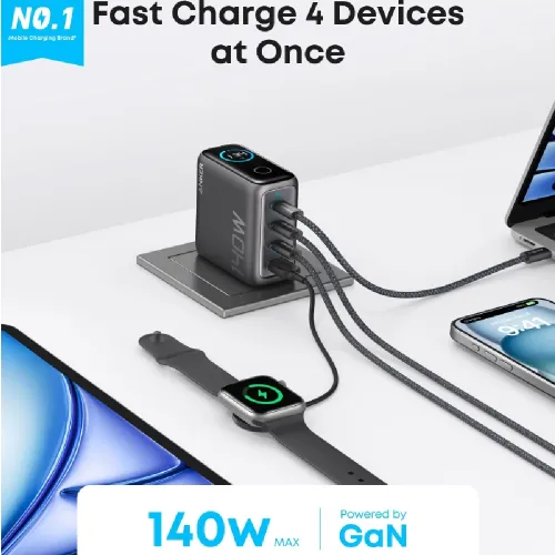 Safety is prioritized with over-temperature protection, automatic power reduction under heavy load, and a secure stacked design. The foldable plug and generous spacing between ports enhance usability and stability. A high-definition touchscreen display provides real-time updates on power, port status, and temperature. Users can monitor charging conditions with clarity, ensuring safe and reliable operation across all connected devices. Anker Zolo 140W PD charger combines elegance, compactness, and advanced safety features, an ultimate fast-charging solution.