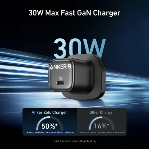 The Anker Zolo 30W IQ & PD 3.0 Type-C Charger Adapter is a compact and powerful solution that offers quick charging, safety, and universal compatibility. The Anker Zolo 30W Type-C Adapter, featuring 30W GaN fast charging technology, can charge an iPhone 16 by up to 50% in just 26 minutes, charging at speeds up to three times quicker than typical 5W adapters. The Anker Zolo 30W Adapter, the world's first TÜV-certified low-temperature charger, boasts dual international safety certifications and innovative temperature control, which keeps the surface 13°C cooler than ordinary chargers, assuring safe and steady performance throughout extended use. The Anker Zolo 30W IQ & PD 3.0 Type-C Charger Adapter, which supports USB-C Power Delivery 3.0 and PPS, has a maximum output of 30W and numerous voltage settings for optimal device charging, including 5V/3A (15W), 9V/3A (27W), 12V/2.5A (30W), 15V/2A (30W), and 20V/1.5A (30W). It supports iPhone fast charging via PD, Samsung 25W Super Fast Charging via PPS, and is fully compatible with the MacBook Air, iPad, Apple Watch, and other USB-C devices. The Anker Zolo 30W Type-C Adapter is 40% smaller than traditional 30W chargers, thanks to breakthrough Gallium Nitride technology, and it has a sleek transparent 3D appearance that highlights the sophisticated internal design. This Anker Zolo 30W Adapter weighs only 49g and is suitable for vacation, office, or everyday use. The Anker Zolo 30W IQ & PD 3.0 Type-C Charger Adapter is a reliable solution for modern charging demands, combining speed, efficiency, and unparalleled safety.