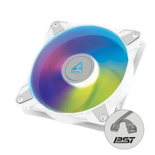 The Arctic P12 PWM PST ARGB White 120mm Casing Fan provides steady airflow, silent performance, and clear illumination in a single balanced package. The Arctic P12 PWM PST ARGB White Casing Fan offers a PWM-controlled speed range of 200 to 2000 rpm, which adapts automatically to meet workload demands. It can even shut down completely below 5 percent PWM for silent operation. The airflow is strong at 48.80 cfm (82.91 m³/h) with a static pressure of 1.85 mmH2O. This allows for efficient movement through cases, radiators, and tight cooling arrangements. Noise output is kept low at 0.3 sone thanks to a fluid dynamic bearing that increases life and smooth spinning. This Arctic Casing Fan uses a normal 12 V DC input, has a starting voltage of 5 V, and consumes only 0.11 A, making it both energy efficient and dependable for long periods of usage. The Arctic P12 PWM PST ARGB White 120mm Casing Fan includes a 4-pin connector, a 4-pin socket for daisy chaining, and a 400 mm cable to facilitate wire management within modern PC cases. Lighting remains spectacular owing to 12 A-RGB LEDs powered by a 3-pin 5 V-DI-GND connector rated at 0.4 A, which is accompanied by a neat black cable with an additional 80 mm sharing segment for flexible lighting setup. The Arctic P12 PWM PST ARGB White Casing Fan, with its standard frame design and operating temperature range of 0 to 40 degrees Celsius, is ideal for gaming systems, workstations, and compact builds. The Arctic P12 PWM PST ARGB 120mm Casing Fan is a good choice for consumers looking for consistent cooling and responsive control, thanks to its well-balanced combination of airflow, pressure, illumination, and efficiency.