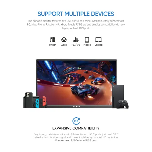 The Arzopa A1S 14" FHD IPS Portable Monitor is a sleek, travel-ready screen that provides clarity, ease of use, and broad compatibility wherever you go. The Arzopa A1S 14" FHD IPS Portable Monitor is a great travel companion for busy professionals and regular travelers. It has a tiny 0.16-inch profile and weighs only 1.1 pounds, making it easy to take to work, school, or for fun on the go. The 14-inch Full HD IPS panel has a sharp 1920x1080 resolution, a balanced 6800K color temperature, and wide 178-degree viewing angles that make it easy to see in both horizontal and vertical orientations. The Arzopa A1S 14" FHD IPS Portable Monitor has a clear anti-glare screen and a 45% NTSC color gamut, which means that the display is smooth for browsing, meetings, and streaming. The Arzopa A1S 14" FHD Portable Monitor has a contrast ratio of 800:1 and a brightness of 250cd/m², so it always shows good pictures inside. It also has built-in speakers that make it easy to listen to audio for everyday multimedia use. There is a Mini HD port for video input and a Type C full function port that enables power, video data, and plug-and-play ease. This means that users may connect with just one cable. The Arzopa A1S 14" IPS Portable Monitor works with various laptops from Apple, Huawei, Microsoft, ASUS, Lenovo, Dell, HP, and others. This makes it great for use at home or in the workplace. It also works with famous smartphones from Samsung, Huawei, Sony, and Razer. However, iPhone users will need a Lightning to HDMI adaptor. The Arzopa A1S Portable Monitor works with gaming consoles including the Switch, Xbox, PS4, PS5, and Steam Deck. It has a refresh rate of 60Hz, so you can always see the same thing. The Arzopa Portable Monitor is a great second screen for travel, work, and enjoyment because it is lightweight, can be used in a variety of ways, and works with a wide range of devices.
