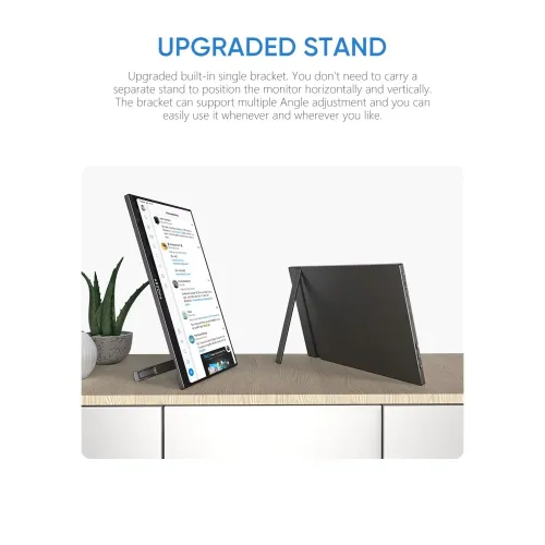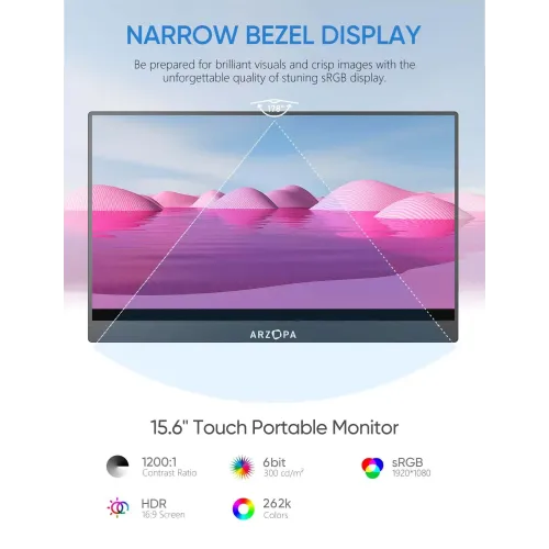 The Arzopa A1T Portable Monitor features a 15.6 inch IPS panel with Full HD resolution at 1920x1080 pixels. The display incorporates advanced 10-point capacitive touch screen technology, enabling intuitive multi-touch gestures and seamless interactive control for users. Operating at 60Hz refresh rate with standard 16:9 aspect ratio, this Arzopa A1T Touch Portable Monitor delivers smooth responsive performance. The IPS panel provides impressive viewing angles of 178 degrees both horizontally and vertically for consistent color accuracy everywhere. With brightness of 300 cd/m2 and contrast ratio of 1000:1, the Arzopa A1T Portable Monitor ensures clear visibility in environments. The display supports 8-bit color depth, reproducing 16.7 million colors for vibrant and accurate visual representation across all content. Connectivity options include one Mini-HDMI port and two Type-C ports, providing versatile compatibility with laptops, phones, and tablets. The Arzopa Touch Monitor eliminates the need for external peripherals by offering direct on-screen interaction through responsive touch capabilities. Built-in speakers deliver clear audio output without requiring additional sound systems, enhancing convenience and simplifying the overall setup process. The Arzopa Portable Monitor features an integrated built-in stand that supports multiple viewing angles for comfortable usage in different scenarios. This Arzopa A1T 15.6" FHD IPS Touch Portable Monitor is perfect for professionals, designers, educators, and students requiring interactive displays. The touchscreen functionality of this Arzopa A1T Touch Portable Monitor enhances collaboration, presentations, digital art creation, and interactive learning experiences. Ideal for use with drawing applications, note-taking software, and interactive presentations that benefit from direct touch input control.