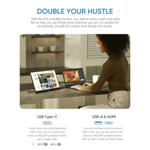 The Arzopa G1 Game Max Gaming Portable Monitor features a vibrant 16.1-inch IPS anti-glare panel with a 1920x1080 Full HD resolution. Users enjoy fluid motion during intense gameplay thanks to the ultra-smooth 144Hz refresh rate provided by this Arzopa Portable Gaming Monitor. With 100% sRGB color gamut and 16.7 million colors, the Arzopa G1 Game Max 16.1" FHD Portable Monitor ensures incredibly accurate and lifelike image quality. The display offers a 1200:1 contrast ratio 300 cd/m2 brightness and a 6800K color temperature for consistent clarity in various lighting conditions. This Arzopa 16.1" Portable Monitor includes wide viewing angles of 85 degrees to allow for easy collaboration and sharing during presentations. Its premium aluminum design makes the Arzopa G1 Game Max Portable Monitor extremely durable while remaining lightweight at only 1.7 pounds. Measuring just 0.3 inches thick, the sleek Arzopa Portable Monitor easily fits into bags for convenient travel between the office and home. The Arzopa G1 Game Max Portable Monitor features dual full-function USB Type-C ports and a Mini-HDMI input for wide device compatibility. You can seamlessly connect this display to your PS5, Xbox, Switch, Steam Deck, smartphone, or laptop for an expanded field of view. A built-in stand supports both portrait and landscape viewing modes to provide versatile setup options for any workspace or gaming station. The integrated 1W twin speakers offer handy audio for videos and games without requiring any additional external audio equipment. This reliable Arzopa G1 Game Max 16.1" 144Hz FHD Portable Gaming Monitor at an affordable price includes a comprehensive two-year warranty for long-term peace of mind. Experience ultimate portability and sharp visuals with the Arzopa Portable Monitor and its 16:9 aspect ratio ordering yours today.