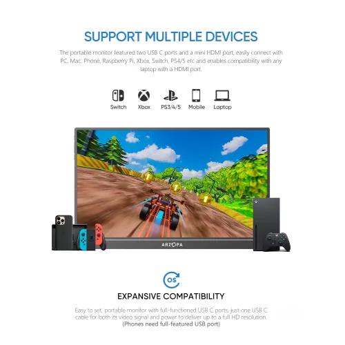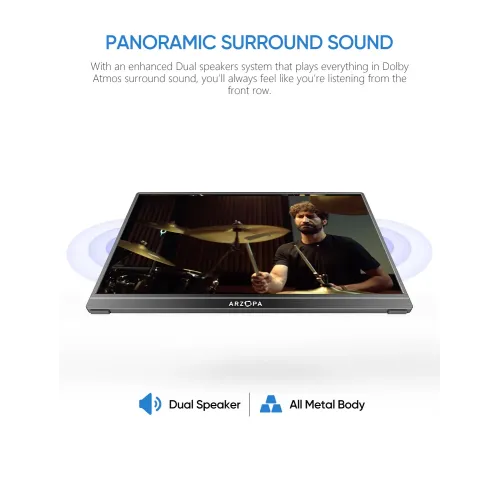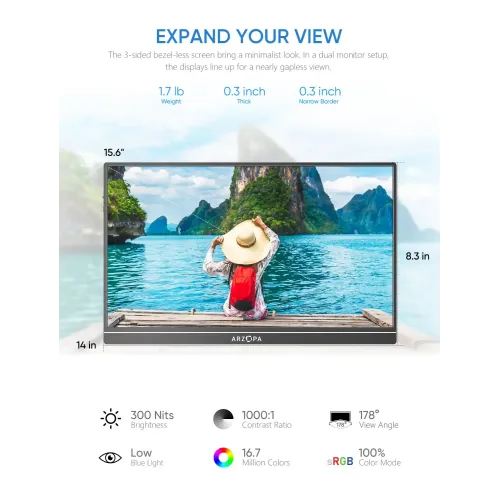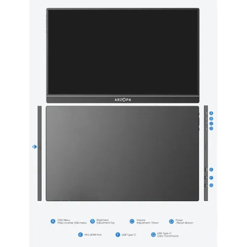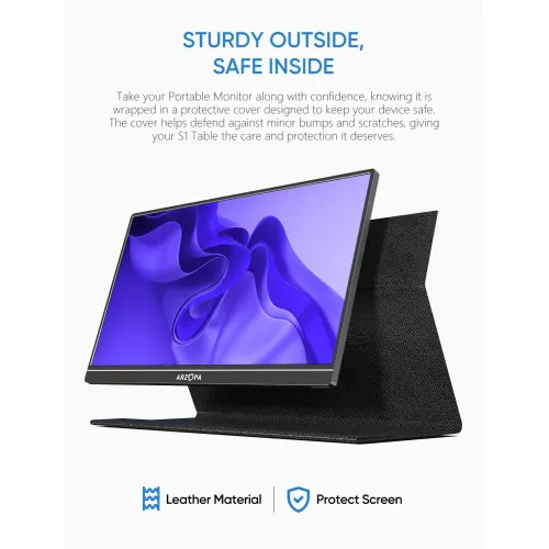The Arzopa S1 Table Portable Monitor features a 15.6 inch IPS panel with 1080P FHD resolution at 1920x1080 pixels. The display offers anti-glare technology and supports 16.7M colors with 72% color gamut coverage for vibrant and accurate visual reproduction. With a brightness level of 300 cd/m2 and contrast ratio of 1000:1, this Arzopa S1 Table Portable Monitor delivers excellent clarity. The screen maintains a color temperature of 6800K and provides visual angles of 85 degrees minimum in all directions for comfortable viewing. Operating at 60Hz refresh rate with a standard 16:9 aspect ratio, the display ensures smooth performance for various applications and tasks. The Arzopa Portable Monitor features versatile connectivity through Mini HDMI for video signal and Type-C full function port supporting video data and power. One USB-C cable conveniently powers the portable monitor while delivering full HD resolution viewing, eliminating the need for multiple cables or adapters. Built-in dual speakers with 1W output each provide clear audio without requiring external sound systems for enhanced user convenience. This Arzopa S1 Table 15.6" FHD IPS Portable Monitor is compatible with USB Type-C mobile phones, enabling easy screen projection and extension. The lightweight design weighing only 860g with an ultra-slim 9mm profile fits easily in any travel bag for maximum portability. The Arzopa S1 Table Portable Monitor supports both landscape and portrait mode orientation, delivering perfect viewing experiences for browsing, editing, or watching. No driver installation is required, making setup quick and effortless for connecting phones, laptops, and compatible devices for increased productivity. Ideal as a secondary monitor for dual-monitor presentations, this Arzopa Portable Monitor empowers on-the-go lifestyles with versatility and efficiency.