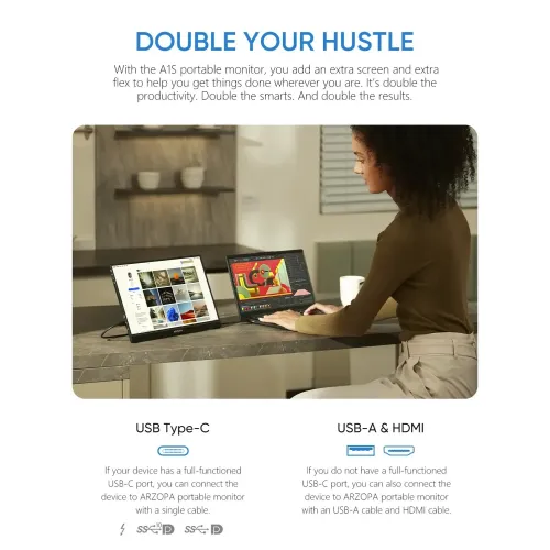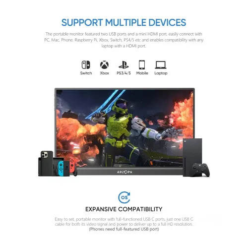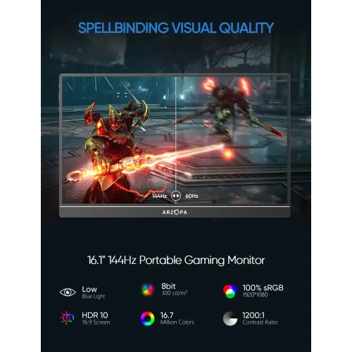 The Arzopa Z1FC 16.1" 144Hz FHD Portable Gaming Monitor delivers a high-performance visual experience for gamers and professionals on the move. This Arzopa Portable Monitor features a vibrant 16.1-inch IPS anti-glare panel with a 1920x1080 Full HD resolution. Users enjoy fluid motion during intense gameplay thanks to the ultra-smooth 144Hz refresh rate provided by this Arzopa Portable Gaming Monitor. With 100% sRGB color gamut and 16.7 million colors, the Arzopa Z1FC 16.1" FHD Portable Monitor ensures incredibly accurate and lifelike image quality. The display offers a 1200:1 contrast ratio 300 cd/m2 brightness and a 6800K color temperature for consistent clarity in various lighting conditions. This Arzopa 16.1" Portable Monitor includes wide viewing angles of 85 degrees to allow for easy collaboration and sharing during presentations. Its premium aluminum design makes the Arzopa Z1FC Portable Monitor extremely durable while remaining lightweight at only 1.7 pounds. Measuring just 0.3 inches thick, the sleek Arzopa Portable Monitor easily fits into bags for convenient travel between the office and home. The Arzopa Z1FC Portable Monitor features dual full-function USB Type-C ports and a Mini-HDMI input for wide device compatibility. You can seamlessly connect this display to your PS5, Xbox, Switch, Steam Deck, smartphone, or laptop for an expanded field of view. A built-in stand supports both portrait and landscape viewing modes to provide versatile setup options for any workspace or gaming station. The integrated 1W twin speakers offer handy audio for videos and games without requiring any additional external audio equipment. This reliable Arzopa Z1FC 16.1" 144Hz FHD Portable Gaming Monitor at an affordable price includes a comprehensive two-year warranty for long-term peace of mind. Experience ultimate portability and sharp visuals with the Arzopa Portable Monitor and its 16:9 aspect ratio ordering yours today.