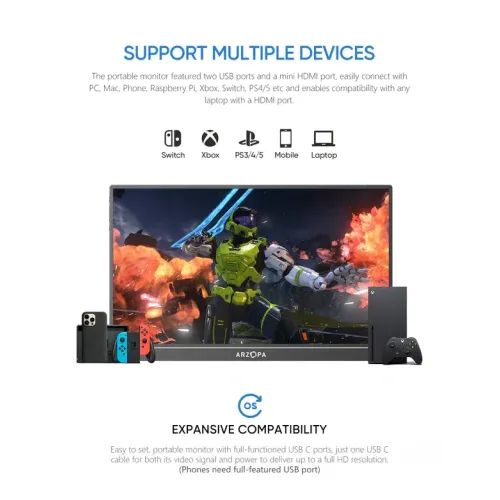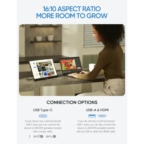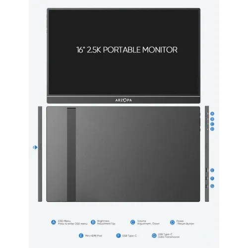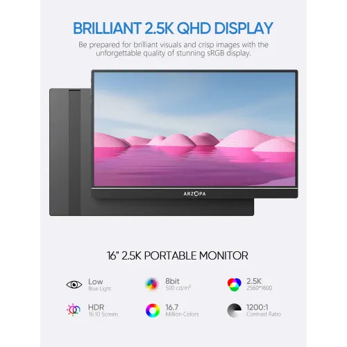 The Arzopa Z1RC 16" 2.5K QHD IPS Portable Monitor has a sleek, lightweight design that makes it easy to move about. It also has sharp images and works with a broad range of devices. The Arzopa Z1RC 16" 2.5K QHD Portable Monitor has a 16-inch IPS display and a clear 2.5K QHD resolution of 2560x1600. It shows beautiful images with rich colors and a comfortable 16:10 aspect ratio that makes work and play more enjoyable. The Arzopa Z1RC 16" Portable Monitor is perfect for travelers, students, and professionals who need a second screen on the go. It is only 0.3 inches thick and weighs 1.7 pounds. The display can show a full range of colors (1.07 billion) and has a high brightness level of 500cd/m², so you can see clearly even in bright places. The Arzopa Z1RC Portable Monitor has a contrast ratio of 1200:1 and wide viewing angles of 85 degrees in both horizontal and vertical directions. This means that the picture will always look good from any angle. Mini HD and Type C full-function connectors make it easy to connect to video, data, and power. The Arzopa Portable Monitor works with a lot of different devices, including MacBook models, the Huawei MateBook series, Microsoft Surface devices, ASUS ZenBook computers, Dell systems, and more. The Arzopa Z1RC 16" Portable Monitor works well with gaming consoles like the PS5, Xbox, and Switch, as well as handheld devices like the Steam Deck. The built-in speakers make it easy to hear, and the 60Hz refresh rate keeps action fluid for casual gaming and streaming. The Arzopa Z1RC 16" 2.5K QHD IPS Portable Monitor is a flexible choice for presentations, multitasking, and creative work since it has a built-in stand that makes it easy to adjust between portrait and landscape settings. This portable display works with a lot of devices, like Samsung, Huawei, Sony, and others. It works well and is very flexible no matter where you are.