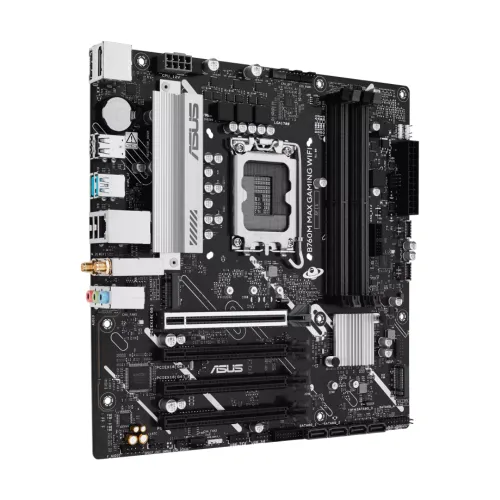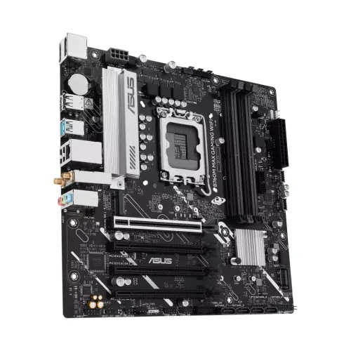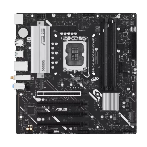 With robust VRM design, heatsinks, and ASUS Fan Xpert software, the ASUS B760M MAX GAMING WIFI Motherboard maintains efficient cooling under heavy loads. Its micro‑ATX form factor makes it suitable for compact cases, while customizable RGB lighting enhances the aesthetics of any gaming setup.