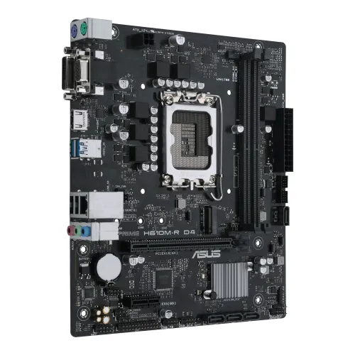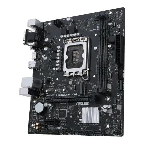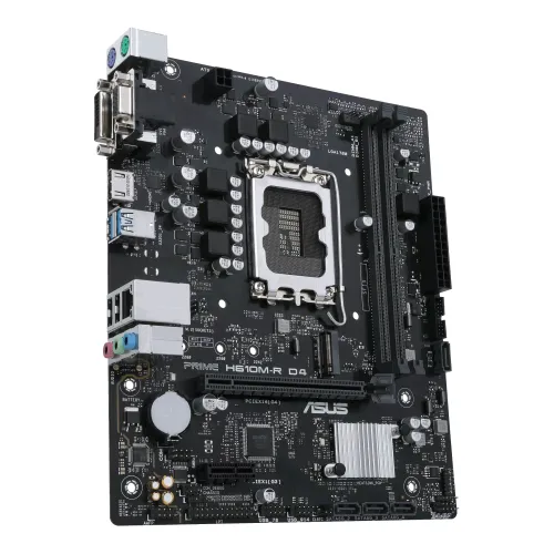 Designed for flexibility, the ASUS PRIME H610M‑R D4 DDR4 LGA1700 mATX Motherboard includes a PCIe 4.0 x16 slot for graphics cards and a PCIe 3.0 x1 slot for expansion cards. Storage options include one M.2 slot (PCIe 3.0 x4/SATA) and four SATA 6Gb/s ports, allowing users to combine high‑speed NVMe SSDs with traditional HDDs for balanced performance and capacity.