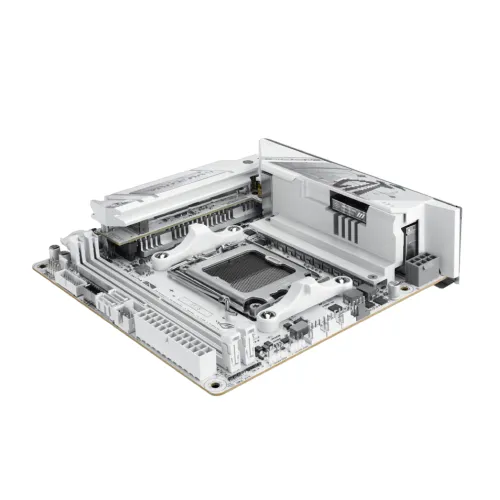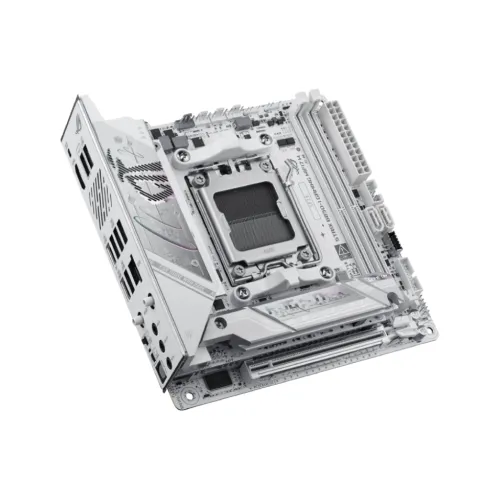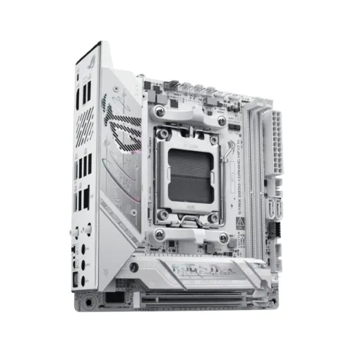 The Asus ROG Strix B850-I Gaming WiFi7 W AM5 Mini-ITX Motherboard is a compact yet powerful solution for gamers and creators who demand high-end performance in a small form factor. Built on the AMD B850 chipset and supporting Ryzen 9000, 8000, and 7000 series processors, this Asus ROG Strix Motherboard delivers next-generation computing with DDR5 memory support up to 128GB and speeds reaching 9600+ MT/s (OC), alongside AMD EXPO and ASUS Enhanced Memory Profile (AEMP) for effortless tuning and stability. Despite its Mini-ITX size, the Asus B850-I Motherboard offers robust expansion with a PCIe 5.0 x16 slot for the latest GPUs, two M.2 slots supporting PCIe 5.0 and 4.0 storage, and two SATA 6Gb/s ports for additional drives. Connectivity is future-ready with Intel 2.5Gb Ethernet, WiFi 7 with 2x2 antenna design, Bluetooth 5.4 with LE Audio, and a versatile USB layout including rear USB 20Gbps Type-C, multiple USB 10Gbps ports, and front USB headers with Quick Charge 4+ support. Audio is powered by the ROG SupremeFX ALC4080 codec with Savitech SV3H712 AMP, delivering immersive 7.1 surround sound with premium capacitors and optical S/PDIF out. Cooling is optimized with dedicated M.2 heatsinks and multiple fan headers, while DIY-friendly features such as a pre-mounted I/O shield, M.2 Q-Latch, PCIe Q-Release Slim, Q-DIMM, Q-LED diagnostics, BIOS FlashBack, and Clear CMOS button simplify installation and upgrades. Finished with Aura Sync RGB lighting and bundled with Armoury Crate, Aura Creator, Fan Xpert 4, GameFirst, and AIDA64 Extreme (trial), the Asus ROG Strix B850-I Gaming WiFi7 W Motherboard combines compact design, advanced performance, and premium features, making it the ultimate Asus Mini ITX Motherboard for small form factor gaming rigs. With its sleek design and cutting-edge connectivity, this board also stands out as an Asus WiFi7 Motherboard and an ASUS White Motherboard, offering both style and substance for enthusiasts who want a future-ready build.