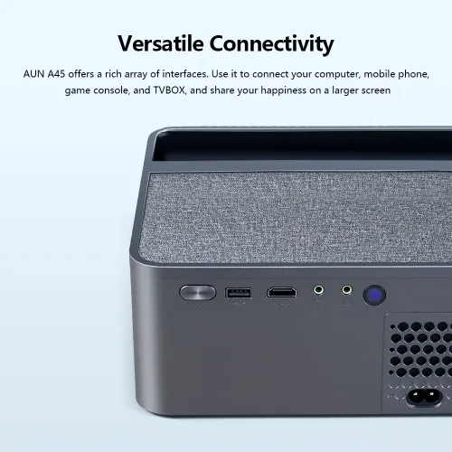 The AUN A45 FHD Home Cinema Android Projector is an affordable and feature-packed option for creating a cinematic experience at home. With its native Full HD resolution of 1920 × 1080 pixels and a 4-inch FHD LCD display, it delivers sharp visuals, vibrant colors, and immersive image quality that brings movies, series, and games to life. The projector supports a 60Hz refresh rate, allowing smooth playback and enjoyable gaming on a large screen that can exceed 100 inches, making it perfect for entertainment with friends and family. Powered by Android 9, the AUN A45 provides a simple and accessible smart interface for streaming content and installing apps. While its 1GB RAM and 8GB internal storage are modest, they are sufficient for basic streaming and everyday use. The built-in dual-band WiFi (2.4GHz and 5GHz) enables convenient wireless screen sharing, allowing users to mirror content directly from smartphones, tablets, or laptops without extra cables. Audio performance is another strong point, as the projector features a powerful 10W HiFi stereo speaker that delivers clear and immersive sound, reducing the need for external speakers in small to medium-sized rooms. In terms of connectivity, the AUN A45 comes with a rich set of ports including HDMI, USB, AV, and a 3.5mm audio output, ensuring compatibility with a wide range of devices such as PCs, TV boxes, smartphones, gaming consoles like PS4, PS5, and Xbox, as well as streaming devices like Firestick. With a brightness of 400 ANSI lumens, the projector performs best in low-light or dark environments, providing a comfortable viewing experience. Overall, the AUN A45 FHD Home Cinema Android Projector is a great choice for users looking for a budget-friendly, versatile projector with solid picture quality, built-in smart features, and wide device compatibility for everyday home entertainment.