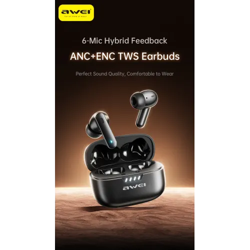 The Awei TA12 TWS earbuds are a feature-rich audio solution that blends modern design, advanced technology, and premium sound engineering for an exceptional wireless listening experience. Engineered with powerful 10mm dynamic drivers, the Awei TA12 earbuds produce deep, punchy bass and clear mids and highs, ensuring a balanced and immersive stereo sound through a sophisticated left-right stereo system. A key highlight of the Awei TA12 is its Hybrid Active Noise Cancellation ANC system, which combines with 6 built-in microphones and Environmental Noise Cancellation ENC to reduce ambient noise during music playback and voice calls. This hybrid ANC setup delivers a significantly quieter listening environment whether you're commuting, working, or on a call. Powered by the efficient JL7016G chipset, the Awei TA12 TWS ensures high-performance signal processing, optimized battery usage, and ultra-low latency connectivity. Connectivity is seamless and reliable thanks to Bluetooth version 5.4, which supports a stable wireless range of up to 10 meters and is compatible with multiple audio profiles such as HFP, A2DP, ATT, AVRCP, AVCTP, AVDTP, SDP, and GAP. These Awei TA12 earbuds operate within the 2.402GHz to 2.480GHz frequency range, minimizing signal interference for a consistent audio stream. Each earbud houses a 40mAh battery, delivering up to 6 hours of playback time or 5 hours of talk time on a single charge with ANC turned off. The included 400mAh charging case, featuring a modern USB Type-C interface, allows for fast recharging, with a full charge cycle completing in just 1.5 hours. Ergonomically designed for comfort and durability, the Awei TA12 TWS weighs only approximately 45 grams, and the compact case measures 63mm in length, 48.16mm in width, and 30mm in height, making it easy to carry in your pocket or bag. Additionally, the Awei TA12 supports voice prompts for easy pairing and control feedback. Styled in an elegant black finish, the Awei TA12 earbuds are a perfect choice for users seeking high-fidelity audio, enhanced call clarity, and noise isolation in a lightweight, portable, and intelligent design.