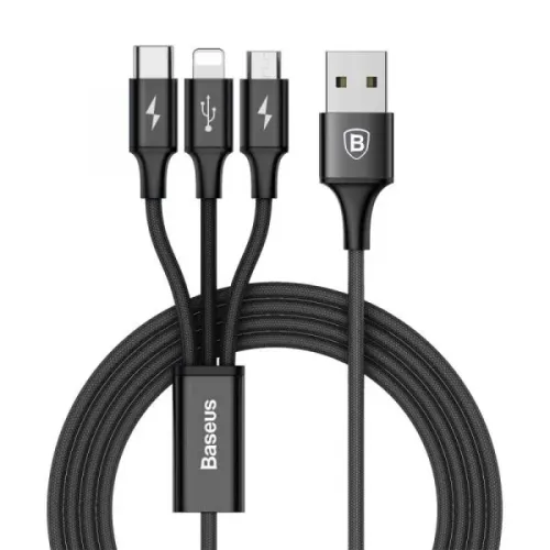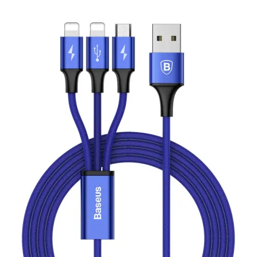 Baseus Rapid Series 3-in-1 Cable comes with Micro USB and Dual Lightning. This cable provides 3A Fast Charging with High-speed transmission and also supports Data Transmission, extreme charging speed, saving time and energy. This 1.2 M cable is built with Aluminum Alloy Connector that has No rust and reduces resistance to ensure the plug is long-lasting, durable, and has no deformation with fine woven wire, preventing the cable from winding, bending easily, durable. It's Strong charge and transfer performance, reducing the resistance of current, speeding up charging by 30 percent. This Baseus Rapid Series cable has 03-months warranty.