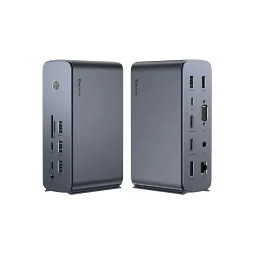 The Baseus Union Joy Pro 17-Port 4 Screen Docking Station is a multifunctional hub that improves productivity for many devices. It comes in a sleek gray finish and features a durable build suitable for professional workspaces. This Baseus Union Joy Pro 17 docking station uses a Type‑C input port with 20V = 6.5A input and provides stable 5V = 0.9A and 5V = 0.5A output. It supports Windows, Apple OS, Linux, and Vista, ensuring wide compatibility for laptops and desktops. With support for 4K@60Hz HDMI, 8K@30Hz DP, 5Gbps USB 3.0, 1000Mbps RJ45, and 104MB/s SD/TF, it handles multitasking with ease. Baseus Union Joy Pro 17 compact dimensions of 5.83 × 3.46 × 1.93 inches and 1.30‑pound weight best option for both office and home setups.