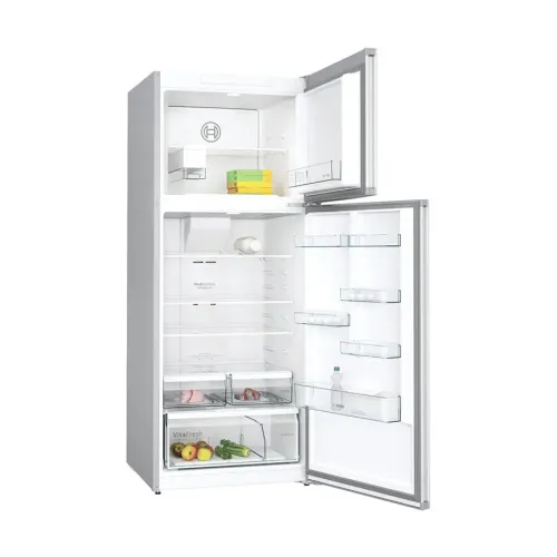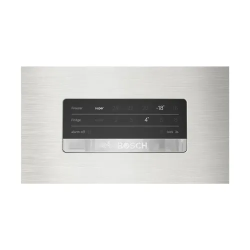 The BOSCH KDN76XL30U Series 4 is a spacious and reliable 581L refrigerator designed to meet the everyday needs of large families. With a total capacity of 581 liters, this 581L fridge provides 430 liters of storage in the bottom refrigerator and 151 liters in the top freezer, giving you plenty of room for fresh produce, beverages, and frozen items. The freezer is positioned at the top, while the refrigerator sits at the bottom, making it easy to organize and access food. The BOSCH KDN76XL30U Series 4 comes with a double-door design and pull-side opening, which adds convenience and practicality. Cooling is distributed smartly, with 74% dedicated to the fridge and 26% to the freezer, ensuring balanced performance. It also features an external temperature display and controller, allowing you to adjust settings quickly and keep food fresh. Inside, LED lighting brightens the compartments, making it easy to find items while saving energy. The silver finish gives the BOSCH KDN76XL30U Series 4 a modern and stylish look that fits well in any kitchen. As a freestanding model, it is easy to place and measures 1860 x 750 x 800 mm, with packing dimensions of 1910 x 810 x 880 mm, and weighs 89.1 kg, offering durability and solid build quality. Bosch’s trusted engineering ensures reliable cooling performance, while the external controls make operation simple and user-friendly. Overall, the BOSCH KDN76XL30U Series 4 combines large capacity, advanced cooling technology, and elegant design, making this 581L refrigerator a practical and stylish choice for everyday food storage.