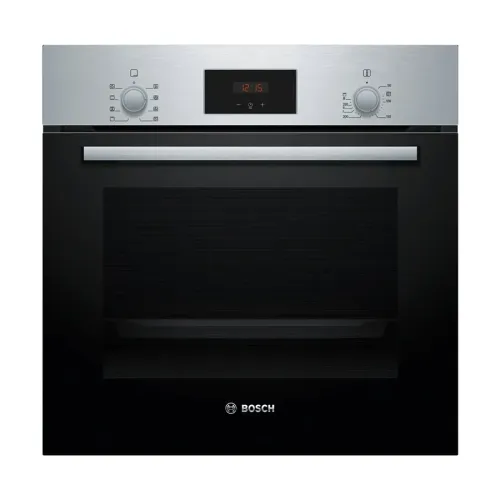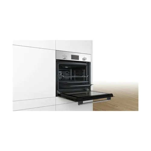 The BOSCH Series 2 HBF113BR0Q is a high‑performance built‑in microwave oven designed to elevate modern kitchens with efficiency, versatility, and advanced cooking technology. Its spacious 66‑liter capacity, this appliance easily accommodates large dishes. Therefore it is ideal for families or anyone who enjoys multitasking during meal preparation. A key highlight of the BOSCH Series 2 HBF113BR0Q is its hydrolytic integrated cleaning system, which utilizes steam to loosen stubborn food residues. This ensures hassle‑free maintenance while promoting an eco‑friendly cleaning process without harsh chemicals. The oven features a clear, easy‑to‑use Red LED display paired with smooth knob controls, allowing users to navigate settings effortlessly. It includes 5 heating and combination modes. They are Hotair Gentle, Hot Air, Conventional Heat, Hot Air Grilling, and Full‑Width Variable Grill. Supported by 3D Hotair technology, the oven ensures consistent heat circulation across up to three levels, allowing multiple dishes to cook evenly and simultaneously. The Fast Preheat function further enhances convenience by significantly reducing preparation time. With a wide temperature range of 50-275°C, the BOSCH Series 2 HBF113BR0Q is suitable for baking, roasting, grilling, and slow cooking. The appliance comes equipped with essential cooking accessories, including an enamel baking tray, a combination grid, and a universal pan, ensuring users have the right tools for various cooking needs. Designed for seamless integration, the oven’s dimensions 595 × 594 × 548 mm fit standard cabinetry, while flexible installation measurements ensure compatibility with different kitchen setups. Despite its generous capacity, the oven maintains a practical net weight of 32.5 kg, ensuring secure and easy installation. Overall, the BOSCH Series 2 HBF113BR0Q combines modern design, user-friendly features, and reliable performance so its a valuable addition to any home. Whether you’re upgrading your kitchen or replacing older appliances, the BOSCH Series 2 HBF113BR0Q offers exceptional efficiency, advanced heating options, and long‑lasting reliability for cooking.