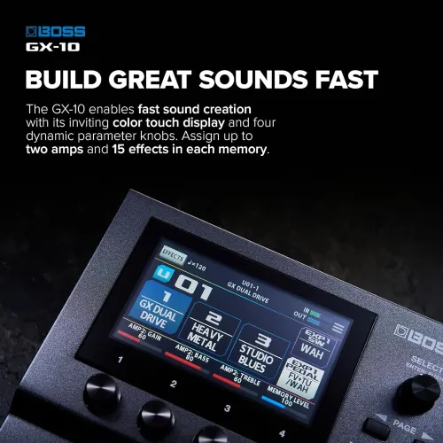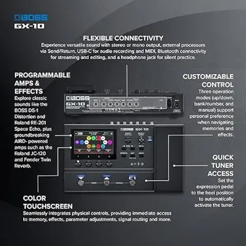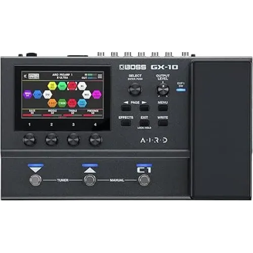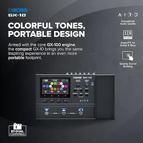 The Boss GX-10 Guitar and Bass Effects Processor is perfectly designed for musicians who want premium tone in a portable package. Based on the powerful engine of the Boss GX-10, this advanced processor brings studio-level sound and flexibility to a travel-ready design. Whether you're playing guitar or bass, the GX-10 delivers pro-grade tone, deep customization, and next-gen connectivity for stage, studio, and practice. At the core of the Boss GX-10 is the same high-end sound engine found in the GX-100. It features 24-bit AD and 32-bit DA conversion, 32-bit floating-point processing, and a 48 kHz sampling rate for unmatched audio clarity. The AIRD (Augmented Impulse Response Dynamics) technology ensures authentic tube amp feel and touch sensitivity across 32 amp types and 170 studio-quality Boss effects. This effects processor allows ultra-flexible signal routing, offering up to 15 assignable effect blocks with dividers, mixers, and send/return support for external pedals. It includes a wide range of speaker types and supports WAV-format impulse response (IR) loading, giving you unlimited cabinet tone options. This makes the Boss GX-10 ideal for live gigs, home recording, or direct amp-free setups. The color touchscreen display (480x272) provides an intuitive interface that makes tone editing easy and fast. Three onboard footswitches and an expression pedal with toe-switch offer real-time control on stage. You can connect up to two additional footswitches or expression pedals for even more control flexibility. The send/return loop lets you integrate your favorite stompboxes with ease. The Boss GX-10 processor also works as a high-quality USB audio interface. Simply connect it to a Mac, PC, or mobile device via USB-C to record, edit, or reamp tracks. Use BOSS Tone Studio software for deep sound editing or download presets from BOSS Tone Exchange, fully compatible with GX-100 Audio Interface Livesets. For wireless editing and audio streaming, add the optional Bluetooth Audio MIDI Dual Adaptor (BT-DUAL). Crafted with a streamlined metal chassis, the Boss GX-10 Portable Audio Mixer & Sound Card is both rugged and lightweight. It’s built for musicians on the move and perfect for modern pedalboard setups. With 198 user memories and 99 factory presets, there’s plenty of space to save your tones. It even features a built-in phrase looper, a high-precision tuner, and extensive I/O including stereo outs, headphones, and MIDI control.