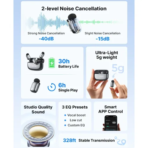 The BOYA mini 2-04 Wireless Microphone is designed for vlogging, interviews, live streaming, and mobile video creation. It produces detailed sound using a high-quality built-in condenser mic with a frequency response of 20 Hz to 20 kHz. With a 48 kHz / 24-bit sampling rate, an 80 dB signal-to-noise ratio, and compatibility for up to 120 dB SPL, the BOYA mini 2-04 Microphone catches voices correctly and without distortion, even in louder circumstances. The BOYA mini 2-04 Wireless Microphone System stands out for its real AI noise cancellation, which includes strong and light modes that successfully decrease background noise while keeping voice natural and clear. The system enables mono, stereo, and safety track output modes, offering producers greater flexibility and security while recording. The BOYA Microphone has a steady wireless transmission range of up to 100 meters, allowing for unfettered mobility during shots without signal drop. Each transmitter weighs only 5 grams, making it easy to wear for extended periods of time, and comes with a long-lasting, non-removable metal clip for secure attachment. The BOYA mini 2-04 Wireless Microphone's battery performance is dependable, with at least 6 hours of recording duration per microphone, and the efficient design allows for extended total usage when combined with suitable charging solutions. The Type-C receiver connects directly to devices and allows for playback without disconnecting, as well as built-in gain control for convenient sound modification. The receiver does not require a separate battery because it is powered directly by the linked mobile device. The BOYA mini 2-04 Wireless Microphone System provides dependable performance thanks to monitoring support, aerospace-grade vacuum coating for durability, and easy plug-and-play operation.