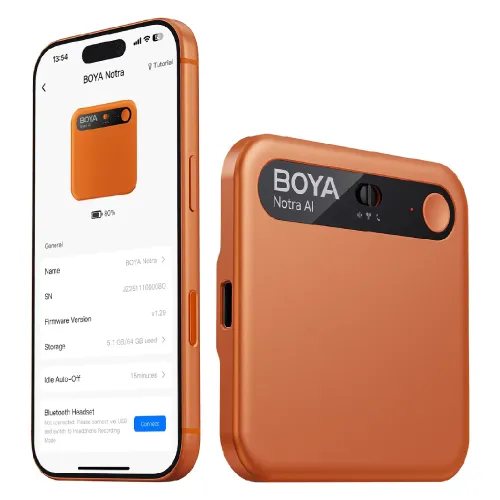 The Boya Notra AI Voice Recorder is a powerful, pocket-sized device designed for professionals and creators. It supports three recording modes. They are ambient, phone call, and Bluetooth. With 64 GB local storage plus unlimited cloud, it ensures your files are always accessible. Equipped with two MEMS microphones and one VPU, it captures audio clearly within a 10-meter range. AI-powered noise cancellation reduces background sounds by up to -30 dB. The Boya Notra AI Voice Recorder offers seamless file transfer via Bluetooth, Wi-Fi, and USB-C. Its 24-hour battery life and 365-day standby make it a reliable recording companion.