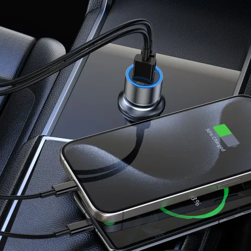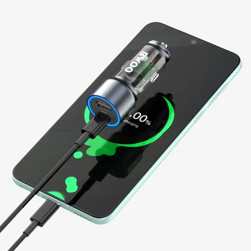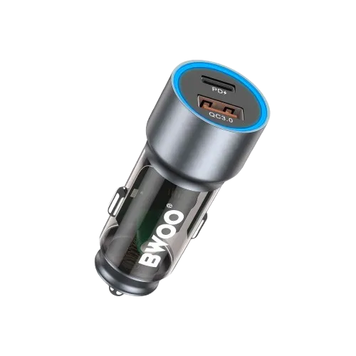 The BWOO BO-CC95 is a high-power, dual-port 45W USB-C car charger designed for fast and safe charging on the go. It features one USB-C port with a maximum output of 25W and one USB-A port with a maximum output of 18W, allowing for a combined total output of 45W to quickly charge two devices simultaneously. The charger supports major fast-charging standards, including Power Delivery (PD) and Qualcomm Quick Charge (QC), ensuring wide compatibility with smartphones, tablets, and other consumer electronics. Built with a durable combination of a fashionable transparent PC shell and aluminum alloy, the BWOO BO-CC95 is equipped with dual smart chips for multiple safety protections against overcharging, overcurrent, and short circuits, making it a reliable and stylish accessory for any vehicle with a 12V-24V input.
