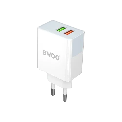 The BWOO BO-CDA132 Dual USB-A 30W Fast Charging Wall Charger is a compact, high-performance charging solution designed for modern mobile users who demand speed, safety, and versatility. Crafted for efficiency and convenience, the BWOO BO-CDA132 wall charger features dual USB-A ports that support simultaneous charging of two devices, making it ideal for travelers, professionals, and tech-savvy households. With a maximum output of 30W, this charger combines QC3.0 18W fast charging with an additional 12W standard output, ensuring rapid power delivery to smartphones, tablets, and other USB-enabled gadgets. The inclusion of Qualcomm Quick Charge 3.0 smart chips enhances charging speed while maintaining low power consumption and high conversion efficiency, protecting your devices from overheating and overcharging. Its universal voltage compatibility and EU plug design make it suitable for use across multiple countries, including Germany, France, and the Netherlands, offering seamless charging during international travel. Housed in a PC flame-retardant shell, the BO-CDA132 prioritizes safety without compromising on style or portability. The charger’s compact build allows it to fit easily into bags and carry-ons, while its robust construction ensures durability for daily use. Whether you're powering up your Android phone, Bluetooth accessories, or portable gaming devices, the BWOO BO-CDA132 delivers reliable, fast, and secure charging performance.