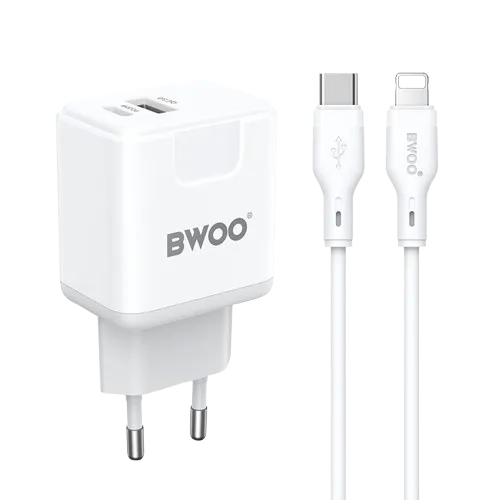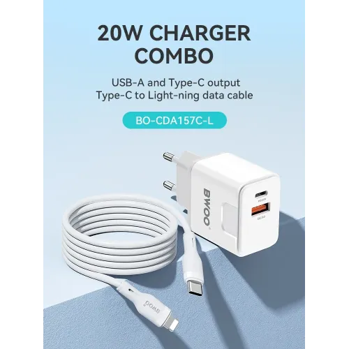 The BWOO BO-CDA157C-L 20W Type-C Charger delivers efficient power output through its dual-interface design—featuring both USB-A and USB-C ports. This charger supports Power Delivery (PD) 3.0 and Quick Charge (QC) 3.0 protocols, enabling rapid charging for a wide range of devices, including smartphones, tablets, and accessories. With a total output of 20 watts, it ensures your devices are powered up swiftly, whether you're using the USB-C port (5V/3A, 9V/2.22A, 12V/1.67A) or the USB-A port (5V/3A, 9V/2A, 12V/1.5A). When both ports are used simultaneously, the charger intelligently balances the load to maintain a stable 5V/3A output, making it ideal for multitasking users. Built with PC+ABS flame-retardant materials, the fast charger offers enhanced durability and safety, while its smart chip technology automatically regulates voltage and current to protect against overcharging, overheating, and short circuits. The wide input range of 100-240V 50/60Hz makes it globally compatible, perfect for travel and international use. Its sleek white finish and lightweight design add a touch of elegance and portability, fitting easily into any bag or workspace. Whether you're an Android or iPhone user, the BWOO BO-CDA157C-L charger is MagSafe compatible and optimized for fast charging across multiple platforms. It comes bundled with a Type-C to Lightning cable, ensuring seamless connectivity.