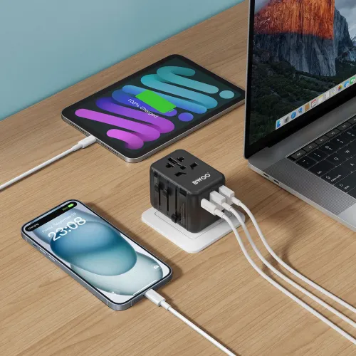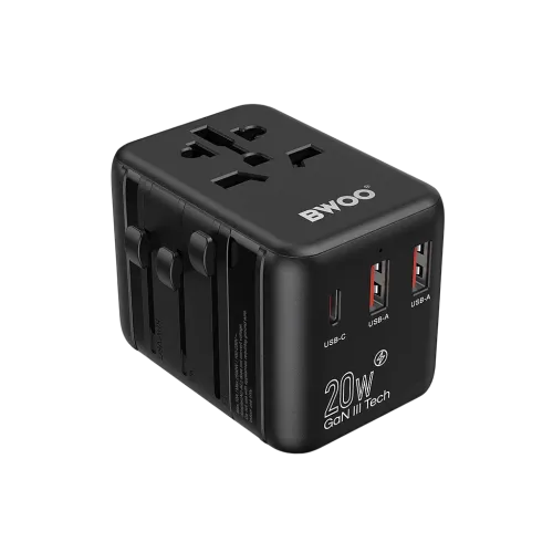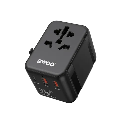 The BWOO BO-UC08 worldwide travel adapter PD 20W features one USB-C port and two USB-A ports, allowing you to charge multiple devices simultaneously, including smartphones, tablets, cameras, and earphones. The USB-C port supports PD fast charging, delivering up to 20W of power for rapid charging of USB-C devices. One USB-A port supports QC fast charging with a maximum output of 18W, while the other USB-A port provides 5V⎓3A to charge an additional device efficiently.