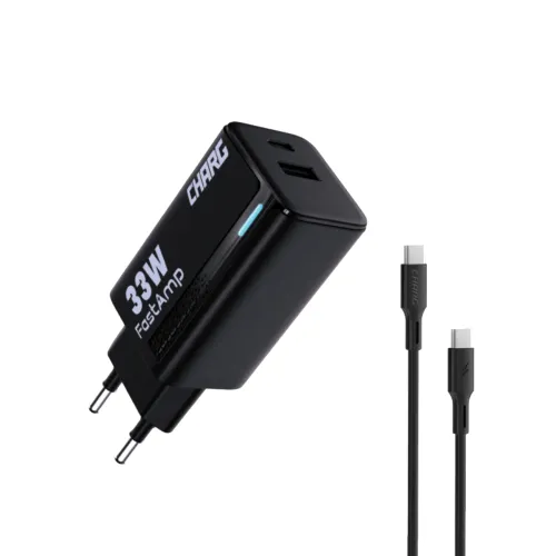 The CHARG FastAmp 33W PD Charger Adapter With Type-C Cable supports PD 3.0 and PPS technology, offering optimized voltage control and efficient power distribution. CHARG FastAmp 33W PD Adapter With Type-C Cable also integrates Qualcomm QC 3.0 technology, ensuring compatibility with a wide range of fast-charging devices. The dual port design includes USB-A and USB-C outputs, allowing users to charge two devices simultaneously with stable performance. USB-A output supports 5V 3A, 9V 3A, and 12V 2.5A, while USB-C output provides the same powerful charging configurations. PPS output ranges from 3.3V to 16V at 2.0A, delivering up to 33W maximum power for supported devices. When using dual output, CHARG FastAmp 33W PD Charger ensures combined output of 5V 3.4A for balanced charging performance. CHARG FastAmp 33W PD Charger Adapter With Type-C Cable includes a USB-C to USB-C cable supporting 3A current for fast charging and data synchronization. The smart chip inside intelligently distributes power and automatically detects connected devices for safe and efficient charging. CHARG Charger Adapter supports multiple fast charging protocols including PD 3.0, PPS, Qualcomm Quick Charge 3.0, SUPER CHARGE, VOOC, DART Charge, MI Turbo Charge, and WARP Charge. Advanced safety features include over-charge, overcurrent, short circuit, overvoltage, and temperature protection for reliable use. The blast-proof fire-resistant design enhances durability and ensures secure charging even during extended sessions. CHARG FastAmp 33W PD Dual Port Charger Adapter With Type-C Cable offers compact portability, making it ideal for home, office, and travel use.