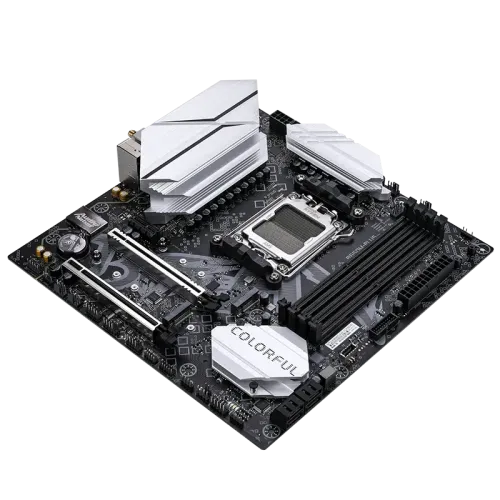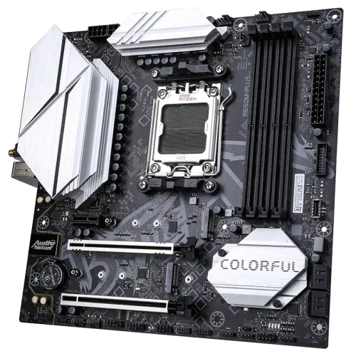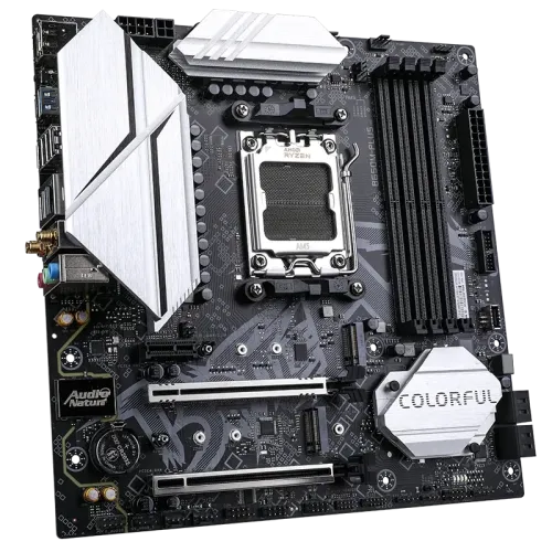 The colorful BATTLE-AX B650M-PLUS WIFI V15 AM5 mATX motherboard is designed for power users, gamers, and producers that require a modern, feature-rich platform with cutting-edge technologies. It supports AMD Ryzen 7000, 8000, and 9000 series CPUs on the AM5 socket, providing future-ready performance for demanding workloads. Memory performance is impressive, with four DDR5 slots enabling up to 192GB total capacity, or 48GB per slot, and speeds of up to DDR5-6800 (OC). The Colorful BATTLE-AX B650M-PLUS WIFI V15 Motherboard features dual-channel RAM architecture and support for XMP and EXPO profiles, ensuring stable and optimum overclocking for quicker multitasking and gaming. Two M.2 slots and four SATA 6Gb/s connectors provide exceptional storage versatility, with support for RAID 0, RAID 1, and RAID 10 across SATA or NVMe SSDs. Both M.2 slots enable PCIe 5.0/4.0 x4, depending on the CPU, resulting in lightning-fast read and write speeds. The colorful BATTLE-AX B650M-PLUS WIFI V15 Motherboard includes rear I/O and provides users with comprehensive connectivity: four USB 2.0 ports, two USB 3.2 Gen 1 Type-A, one USB 3.2 Gen 2 Type-A, and one USB 3.2 Gen 1 Type-C connector, as well as HDMI 1.4 and DP 1.2 outputs for 4K monitors. A 2.5G LAN port, Wi-Fi 6 via the AX200 wireless card, and Bluetooth 5.2 provide easy device connection. Expansion features one PCIe 5.0 x16 slot for graphics cards, one PCIe 4.0 x16 slot that runs at x4, and one PCIe 4.0 x1 slot for additional gear. The colorful BATTLE-AX B650M-PLUS WIFI V15 Motherboard also has several fan headers, a pump header for water cooling, and RGB compatibility via 5V ARGB and 12V RGB headers. The UEFI BIOS supports 128M with multi-language compatibility, and hardware monitoring includes fans, temps, and voltages for complete system control. The audio is driven by the Realtek ALC897 codec, which supports 5.1-channel immersive sound. This mATX board, measuring 245mm x 245mm, is ideal for tiny setups while providing high performance.