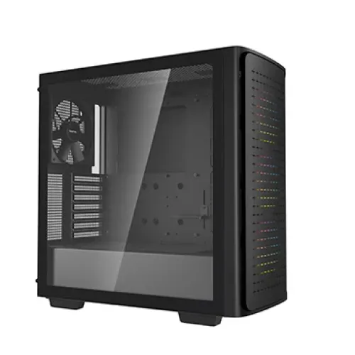 The DeepCool CK560 E-ATX mid-tower case delivers a premium blend of performance airflow and modern aesthetics for gamers and creators who demand flexibility and style Its spacious interior supports Mini-ITX Micro-ATX ATX and E-ATX motherboards while accommodating GPUs up to 380mm and CPU coolers up to 175mm making it ideal for high-end builds The DeepCool CK560 Casing features a quick-release ventilated front panel and a full-sized tempered glass side panel that showcases your components and RGB lighting with elegance Pre-installed with three 120mm ARGB fans and one 140mm performance fan it offers strong airflow out of the box and supports up to six 120mm or five 140mm fans along with liquid cooling radiators up to 360mm in the front and 280mm on top Storage is streamlined with two tool-less 3.5 inch drive trays and two quick-release 2.5 inch SSD mounts Cable management is simplified with rubber grommets and ample routing space behind the motherboard tray while magnetic dust filters on the front top and bottom keep the system clean The front I O panel includes dual USB 3.0 ports a USB Type-C port and a combo audio jack plus a dedicated RGB control button for lighting customization With its anti-sag GPU bracket reusable PCIe baffles and layout the DeepCool CK560 Gaming Casing is engineered for smooth installation and long-term upgrade potential making it a standout choice for users who value airflow expandability and visual impact in one refined chassis