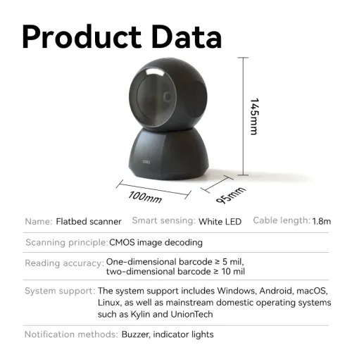 closeThe Deli ES236 Wired Barcode Scanner is a powerful and efficient scanning solution designed for seamless data capture across various applications. Featuring an advanced CMOS image sensor, this Scanner delivers precise and rapid scanning of both 1D and 2D barcodes, ensuring high accuracy in retail, logistics, inventory management, and office settings. The red LED and white LED light sources enhance readability under diverse lighting conditions, optimizing performance even in dim environments. Built for durability, the anti-shock and anti-drop design ensures reliability in demanding workplaces, preventing damage from accidental falls. With an impressive 5-million button lifespan, the Deli ES236 scanner guarantees long-term usability without compromising on responsiveness. Compatibility is never an issue, as the Deli ES236 seamlessly integrates with various software and operating systems, making setup and operation hassle-free . Designed in a sleek black finish, this wired scanner offers a stable connection for uninterrupted data transmission, eliminating connectivity concerns associated with wireless alternatives. Whether you need a barcode scanner for retail checkout, warehouse management, or document processing, the Deli ES236 Barcode Scanner combines speed, precision, and durability to enhance productivity while ensuring optimal user experience.