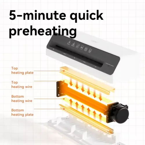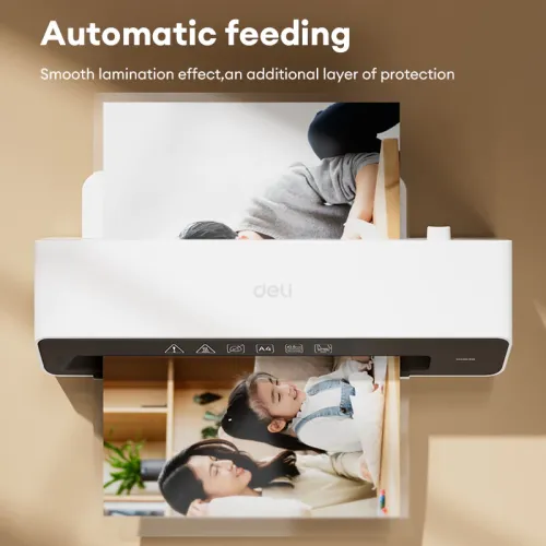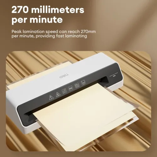 The Deli ET100 A4 Laminating Machine has a maximum laminating width of up to 230mm, providing for easy handling of certificates, notices, pictures, and educational materials. With a steady laminate speed of 270mm/min, the Deli Laminating Machine produces high-quality results while saving time on daily activities. The laminating thickness capacity of up to 0.5mm provides compatibility with common laminating pouches, offering papers increased resilience and long-term protection. Deli ET100 Laminating Machine employs a dependable thermal heating mode that ensures even heat distribution for clear, bubble-free lamination. The warm-up period of around five minutes allows for quick preparation before usage, making the Deli ET100 A4 Laminating Machine ideal for busy situations. This Deli Laminating Machine runs on a reliable 230V and 50Hz power source, providing safe and consistent performance. The Deli ET100 Laminating Machine's compact design, user-friendly operation, and consistent results make it a smart investment for document protection, presentation quality, and everyday lamination needs in modern offices, schools, print corners, and home workspaces, ensuring neat, professional-looking output while supporting efficient workflow, long-term document preservation, and reliable daily use for users who value quality, simplicity, safety, and trustworthiness.