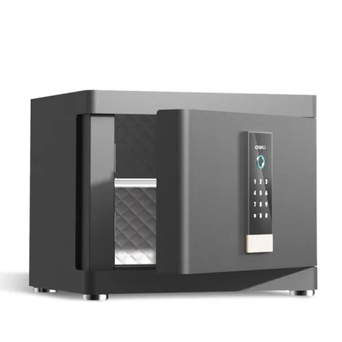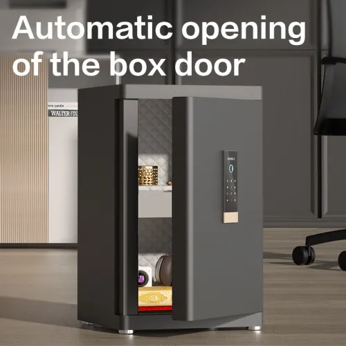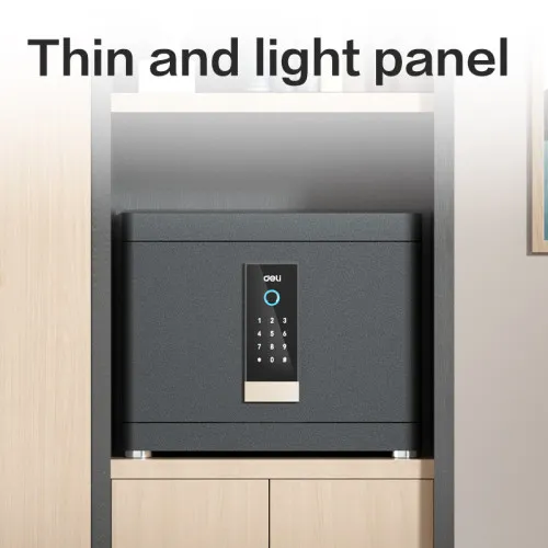 The Deli ET592 Fingerprint Password Digital Locker & Vault gives high-level security with a durable, heavy-duty carbon steel construction, ensuring reliable protection for valuables like important documents, cash, and jewelry. The automatic door system allows seamless access using fingerprint recognition, password authentication, and key access. With an electronic touch panel display, users can operate the safe effortlessly while benefiting from advanced security features. An integrated alarm system provides immediate alerts if an incorrect password is entered or if there is unexpected movement, preventing unauthorized access. The Type-C emergency power support keeps the Safe Box / Locker / Vault functional during power outages, ensuring continuous security. Inside, the leather-lined interior adds an elegant touch while safeguarding stored items from scratches.D esigned with a sturdy 4mm door thickness and a 2.5mm box thickness, the Deli ET592 Digital Safe Box Locker reinforces its ability to withstand tampering. The external dimensions measure H31 x W38 x D29 cm, including foot pads for stability, while the inner space of H29 x W37 x D22 cm provides ample storage. With a weight of 18.5 kg, this Deli ET592 Digital Safe Box maintains its position securely without shifting. Finished in a sleek black color, the Deli ET592 Fingerprint Password Digital Safe Box Locker blends seamlessly into home or office environments, offering a perfect balance of advanced security and modern aesthetics. Its compact yet spacious design makes it ideal for safeguarding valuables while complementing professional and personal spaces with a sophisticated look.