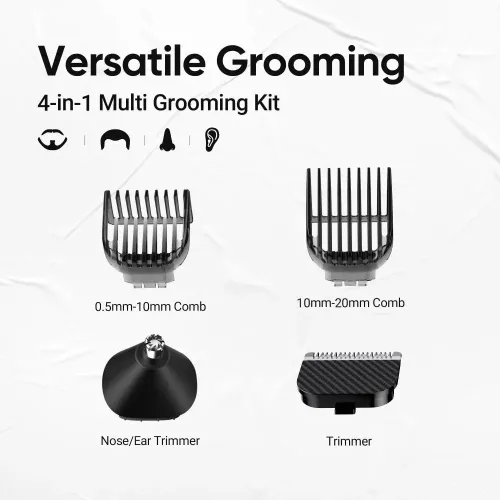 | Others | Trimming Range: 0.5 – 20 mm For Beard & Moustache, Nose, Ear & Eyebrow Versatile Grooming, 4-in-1 Multi Grooming Kit IPX5 Fully Washable 40 length setting Type C Charge, 10 min Charge = 15 min use 240 min Battery Run time |