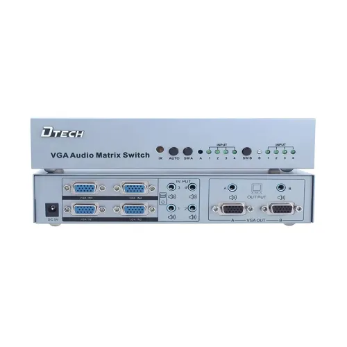 The Dtech DT-7026 VGA Matrix Switcher is designed for smooth switching between multiple VGA sources and displays. Featuring 4 input and 2 output VGA female ports, this high-performance switcher supports Full HD resolution (1920 x 1080) for crisp, clear visuals across desktops and laptops running Windows OS. With hot-swappable functionality, users can freely switch computers without shutting down the matrix—no software installation required. The sleek gray design includes front panel buttons and a 10-meter range remote control, offering flexible switching and easy installation. Ideal for professional AV setups, classrooms, and control rooms, the Dtech DT-7026 Converter supports cascading for expanded configurations. Dtech DT-7026 includes the switcher and power adapter. Whether you're managing presentations or multi-screen environments, this VGA matrix switcher delivers reliable performance and user-friendly control.