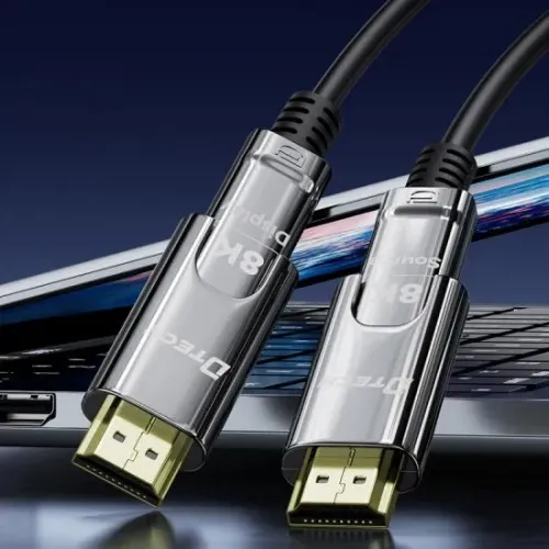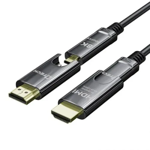 The Dtech DT-HF3050 50 Meter Fiber Optic HDMI Cable is intended for consumers who want consistent, high-quality audio and video transmission over extended distances without signal degradation. This innovative Dtech DT-HF3050 HDMI Cable supports 8K resolution at 60Hz, 4K at 120Hz, and 2K at 144Hz, providing crystal-clear images with HDR and Dynamic HDR for true-to-life colors, sharp contrasts, and smoother action. Its 48Gbps ultra-fast bandwidth offers lag-free performance whether viewing movies, gaming, or performing professional AV presentations. The Dtech DT-HF3050 Type-D to Type-A Dual Connector HDMI Cable, with its Type-D to Type-A dual connector design, is versatile and compatible with a variety of devices, including projectors, gaming consoles, PCs, and high-end TVs. The gold-plated connections improve longevity and signal transmission stability, while the fiber optic + copper core allows for long-distance data transfer up to 50 meters while remaining completely resistant to EMI and RFI interference. Built with a slim yet robust PVC jacket, the cable is lightweight, simple to install, and totally plug-and-play, requiring no extra power. This Dtech DT-HF3050 50 Meter HDMI Cable supports premium audio formats such as eARC, Dolby Atmos, DTS:X, and uncompressed sound, making it ideal for creating an immersive home theater experience, powering professional conference rooms, or updating high-performance gaming setups.
