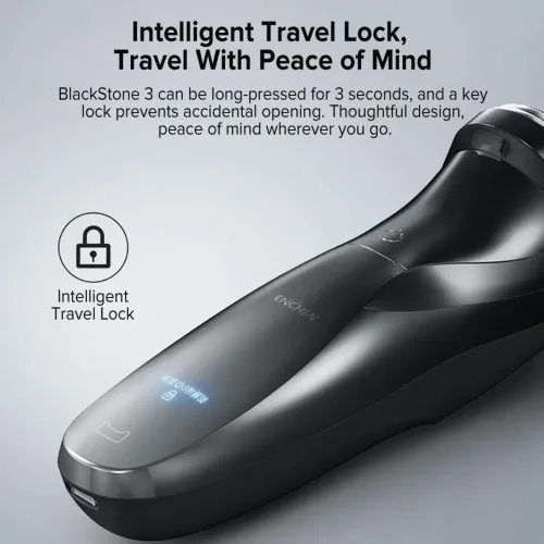 The Enchen Blackstone 3 Electric Shaver features a powerful floating shaving system with three blade heads. Its 3D floating blades adjust automatically to facial contours for smoother and closer shaving results. This intelligent design reduces skin irritation while maintaining consistent shaving performance. Powered by a 5W motor, the Enchen Blackstone 3 Electric Shaver provides reliable cutting power for daily grooming. The intelligent anti-clip system prevents hair pulling and improves shaving comfort. With a full charge time of 150 minutes, the shaver delivers up to 150 minutes of runtime. This extended battery life supports multiple grooming sessions without frequent recharging. The Enchen Blackstone 3 Electric Shaver includes a built-in pop-up trimmer for precise beard shaping and sideburn maintenance. Its LCD display clearly shows battery capacity and operation indicators. A multi-functional indicator helps users monitor device status easily. The travel lock feature prevents accidental activation during travel or storage. Designed for flexibility, the Enchen Blackstone 3 Electric Shaver supports both wet and dry shaving. The entire device is IPX7 waterproof and fully washable for convenient cleaning. Users can rinse the shaver under running water after use. The durable ABS and stainless steel construction ensures long-lasting reliability. Weighing only 139 grams, the Enchen Blackstone 3 Electric Shaver offers a lightweight and comfortable grip. The plug-and-shave capability allows convenient use while charging.