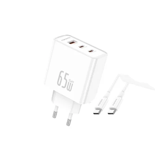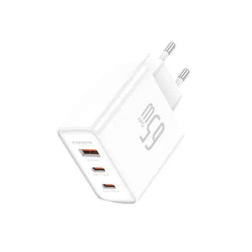 The FONENG GaN50-EU 65W Fast Charger with Type-C Cable is a powerful and versatile charging solution designed for modern devices, combining advanced Gallium Nitride (GaN) technology with a compact and travel-friendly build. This FONENG 65W Charger delivers efficient, high-speed charging while maintaining lower heat output, making it ideal for laptops, smartphones, and tablets. With its triple-port design—two USB-C ports and one USB-A port—it allows users to charge multiple devices simultaneously, intelligently distributing power to maximize efficiency. The primary USB-C port supports up to 65W output, perfect for laptops and ultrabooks, while the secondary USB-C and USB-A ports provide 20W and 18W respectively, ensuring fast charging for phones and accessories. Measuring just 52.5 × 87.5 × 29 mm and weighing around 106g, the FONENG 65W Adapter is lightweight and portable, making it a reliable companion for travel or daily use. Safety features such as over-voltage, over-current, and short-circuit protection guarantee secure charging, while the included Type-C to Type-C cable supports up to 60W output for seamless compatibility with a wide range of devices. Whether you need a compact laptop charger, a fast phone adapter, or an all-in-one travel solution, the FONENG 65W charger with Type-C Cable stands out as a practical, efficient, and future-ready choice for powering multiple devices at once.