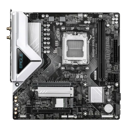 The GIGABYTE B840M EAGLE WIFI6 AM5 Motherboard supports AMD Ryzen 9000, 8000, and 7000 Series processors on the AMD Socket AM5 platform. Powered by the AMD B840 chipset, the GIGABYTE Motherboard ensures stable computing with a digital 5+2+2 phases VRM solution. Dual channel DDR5 architecture supports up to 128GB across two DIMMs with speeds reaching 7600 MT/s overclocked. AMD EXPO and XMP profiles optimize memory, while D5 Bionic Corsa enhances infinite memory performance. The GIGABYTE B840M EAGLE WIFI6 Motherboard has EZ-Latch PCIe and M.2 slots feature quick release and screwless design for effortless installation. M.2 heatsinks also use screwless EZ-Latch design, supported by VRM Thermal Armor Advanced and M.2 Thermal Guard. The GIGABYTE Motherboard includes two M.2 connectors and four SATA 6Gb/s ports with RAID 0,1,5,10 support. PCIe UD Slot provides 10X strength for graphics cards and improved heat dissipation. The GIGABYTE B840M EAGLE WIFI6 Motherboard integrated AMD Radeon Graphics supports DisplayPort 1.4 at 3840x2160@144Hz and HDMI 2.1 at 4096x2160@60Hz with HDR. Realtek 2.5GbE LAN and Realtek Wi-Fi 6 RTL8851BE with Bluetooth 5.3 deliver fast networking. Expansion includes PCIe 4.0 x16 CPU slot and PCIe 3.0 x4 chipset slot. USB connectivity covers USB 3.2 Gen1, USB Type-C header, and multiple USB 2.0 ports. The GIGABYTE B840M EAGLE WIFI6 AM5 Motherboard has internal connectors include ATX power, fan and pump headers, RGB Gen2 headers, TPM header, and Clear CMOS jumper. Back panel offers PS/2, Q-Flash Plus button, SMA antenna connectors, RJ-45, audio jacks, HDMI, and DisplayPort. Licensed AMI UEFI BIOS with 256 Mbit flash supports Q-Flash, Smart Backup, and GCC software. Micro ATX form factor ensures compatibility with Windows 11 and Windows 10 64-bit systems.
