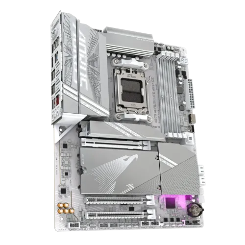 The GIGABYTE X870 AORUS ELITE WIFI7 ICE DDR5 AMD AM5 ATX Motherboard is a high-performance motherboard designed to support AMD Ryzen 9000, 8000, and 7000 Series processors, leveraging the power of the AMD Socket AM5 and advanced DDR5 memory technology. With four DIMM slots supporting dual-channel DDR5 memory and AMD EXPO Memory Module Support, it offers overclocking capabilities up to 8600MT/s, ensuring top-tier performance and compatibility. The motherboard features a robust digital twin 16+2+2 phases VRM solution, providing consistent and high-powered performance, ideal for overclocking and demanding applications. Efficient cooling solutions, such as the DDR Wind Blade for active cooling of memory modules and VRM Thermal Armor Advanced with I/O ZONE, keep your system cool under pressure. It also offers ultra-fast storage options with four M.2 slots, including three PCIe 5.0 x4 slots, for quick data access and transfer. Enhanced connectivity features such as 2.5GbE LAN, Wi-Fi 7, dual USB4 Type-C with DP-Alt, and HDMI provide versatile and high-speed networking options. The user-friendly design includes M.2 EZ-Match magnetic alignment, EZ-Latch Plus for PCIe and M.2 slots, and a friendly UI with multi-theme support, making installation and management a breeze. Additionally, the motherboard delivers superior audio quality with Realtek ALC1220 HD Audio and WIMA audiophile-grade capacitors, ensuring an immersive audio experience. Overall, the GIGABYTE X870 AORUS ELITE WIFI7 ICE DDR5 AMD AM5 ATX Motherboard is the ultimate choice for those seeking to unleash the full potential of their system with advanced memory support, robust power delivery, efficient cooling solutions, and extensive connectivity options
