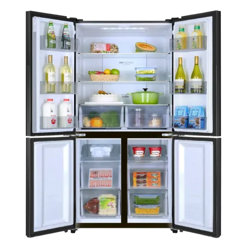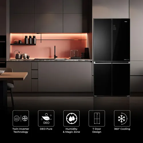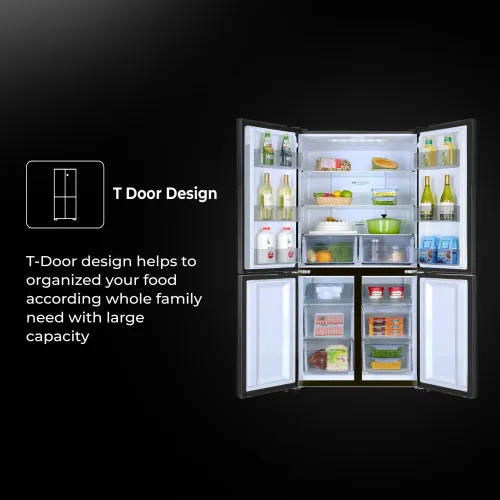 The Haier HRF-578TPB 522L French T-Door Refrigerator has a large 522-liter total gross capacity, with 328 liters dedicated to fresh food storage and 194 liters reserved for the freezer, making it excellent for families who shop in bulk or keep a variety of food items. The Haier HRF-578TPB 522L Refrigerator employs No Frost cooling technology to minimize ice buildup while maintaining even airflow and freshness across all compartments. Twin Inverter Technology combines an inverter compressor and R600a refrigerant to provide energy-efficient, silent, and consistent performance over a wide voltage range of 167V to 252V, making it appropriate for a variety of power circumstances. The Haier HRF-578TPB 522L Refrigerator features a French T-Door design with a premium piano black glass finish and recessed handles for a sophisticated appearance while providing easy access to several storage compartments. Independent Humidity Control and the Magic Zone allow for accurate temperature adjustments for various food kinds, while DEO Pure antibacteria technology keeps the interior clean and odorless. Inside, the Haier HRF-578TPB Refrigerator has three sturdy shelves, six drawers, two crispers, six door pockets, and a built-in ice maker and egg tray for daily convenience. Designed for climate class T, this Haier Double Door Refrigerator also functions as a Haier Multi Door Refrigerator, providing accurate temperature control, dependable food preservation, and long-lasting performance for common family demands.