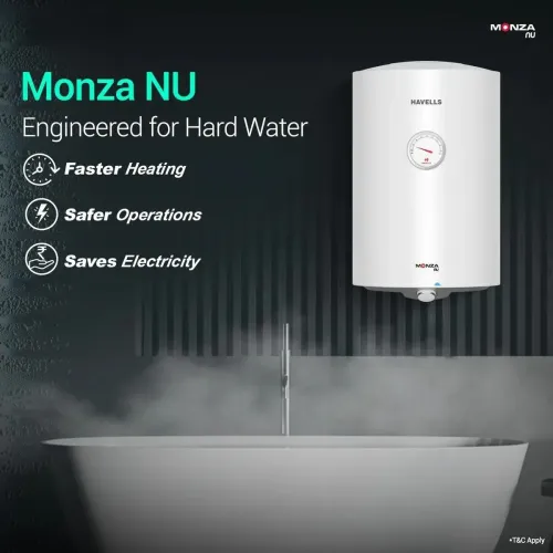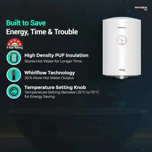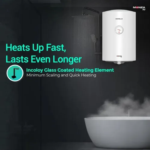 The Havells Monza NU 35 Litre Geyser, made with revolutionary Feroglas Technology, protects the inner tank from corrosion and scaling, providing long-lasting performance even with frequent usage. The Incoloy glass-coated heating element provides faster and safer heating while maintaining consistent efficiency over time. With a rated capacity of 35 liters, the Havells Monza NU Geyser is excellent for medium to large families, providing plenty of hot water for baths, kitchens, and utility purposes. This Havells Geyser is powered by a powerful 2000W heating system that heats water swiftly and evenly. Whirl Flow Technology optimizes heat retention and general water movement inside the tank. The addition of an anode rod provides an additional layer of protection by minimizing corrosion and increasing the life of the Havells Monza NU 35 Litre Geyser. It is designed for high-pressure performance and can withstand operating pressures of up to 0.8MPa, making it ideal for high-rise structures and places with unpredictable water supplies. Water resistance and splash-proof protection rated at IPX4 ensure reliable performance in humid bathroom situations, addressing safety concerns. An adjustable temperature control knob allows customers to easily choose their preferred water temperature, and an integrated thermostat ensures accurate management. The Havells Monza NU Geyser uses 230 V, single-phase, 50 Hz AC electricity, making it compatible with most residential electrical systems. Its remarkable 5-star efficiency rating emphasizes its energy-efficient design, which helps reduce electricity use while maintaining performance. The Havells Geyser stands out as a reliable solution because of its balanced combination of durability, smart heating technology, and energy efficiency.