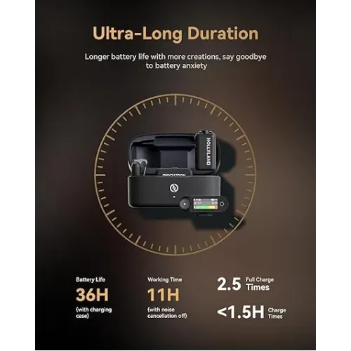 | Others | Charging Case: > 2.5 times charging for 2 TX and Camera RX at the same time Earphone Charging Case: > 1.8 times charging for 2 OWS Monitor Earphone at the same time TX: Approx. 1.5 hours Camera RX: Approx. 1.5 hours Charging Case: Approx. 2 hours OWS Monitor Earphone: Approx. 1.6 hours Wireless Modulation Mode-GFSK 2 Mbps Wireless Transmission-2.4 GHz Adaptive Frequency Hopping (AFH) Transmission Range-TX: 1,115ft (340m) for LOS / 197ft (60m) for NLOS OWS Monitor Earphone: 328ft (100m) for LOS / 197ft (60m) for NLOS Sample Rate and Bit Depth-48 kHz / 32-bit Float & 48 kHz / 24-bit 4 Transmitters & 1 Receiver, AI Noise Cancellation Full-Chain Audio Transmission |