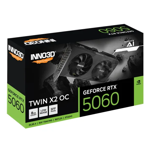 The INNO3D RTX 5060 TWIN X2 OC V2 supports DLSS 4, Ray Reconstruction, and Super Resolution, powered by fifth‑generation Tensor Cores for enhanced image quality and boosted FPS. With PCIe Gen 5 support, DisplayPort 2.1b, and HDMI 2.1b outputs, it delivers ultra‑high refresh rates up to 4K at 480Hz or 8K at 165Hz with DSC. Cooling is handled by INNO3D’s TWIN X2 dual‑fan design, ensuring quiet operation and stable performance under heavy gaming loads. Compact yet powerful, this INNO3D graphics card offers excellent value for those seeking a budget‑friendly RTX 50 series GPU with next‑gen features and reliable cooling.