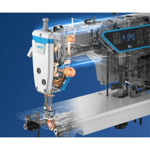 The Jack A4C-C Direct Drive Lockstitch Industrial Sewing Machine is an innovative, high-efficiency solution designed for professional garment manufacture that provides unrivaled precision, durability, and performance. The Jack A4C-C Sewing Machine is the flagship model in Jack's portfolio, including the unique Octopus Nine-Brain AI Chip, a powerful engine that enables the NTB System to intelligently evaluate over 200,000 fabric samples at an astounding 10,000 computations per second. This enables excellent fabric feeding and consistent stitch quality, even at the machine's amazing maximum sewing speed of 5,000 stitches per minute. Jack's 0-Degree Thread Path Technology reduces thread tension by up to 30%, resulting in smoother thread handling, less breakage, and longer thread life—making it suitable for working with a variety of fabrics, from delicate cotton to medium-weight synthetics and heavy denim. The Jack A4C-C Direct Drive Lockstitch Industrial Sewing Machine has an energy-efficient direct-drive motor and a stepper motor for accurate presser foot lift and reverse stitching. It has automated stitching features, a needle threader, and an automatic thread cutter to ensure smooth operation. With a stitch length of up to 5 mm and a presser foot lift range of 5-13 mm, this machine combines versatility and speed. It supports DBX1 11-18# needles in a two-thread configuration, ensuring reliable performance in high-volume production situations. Additional features, such as LED lighting and a clear display, improve use and decrease operator fatigue. The Jack A4C-C, measuring 695 × 295 × 550 mm and weighing 36 / 42 kg, combines precision engineering, intelligent automation, and energy efficiency. It is ideal for garment factories, tailoring businesses, and textile production units looking for consistent stitch quality, high productivity, and reliability.