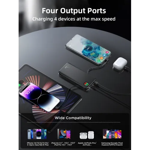 The Joyroom JR-L015 22.5W 20000mAh Power Bank is a high-performance, multi-functional power bank designed for users who demand fast, reliable, and versatile charging on the go. With a massive 20000mAh capacity (74Wh), it ensures extended power backup for smartphones, tablets, and other USB-powered devices. Engineered with four output ports, including USB-A, Type-C, and built-in IP & dual C cables, this power bank supports simultaneous charging of up to four devices at full speed, making it ideal for travel, outdoor adventures, and emergency use. The Joyroom JR-L015 features advanced fast-charging technology, delivering up to 22.5W output via USB-A and cable ports, and 20W via Type-C, ensuring rapid power delivery for compatible devices. Its dual input options (Type-C and Micro USB) support up to 18W fast input, allowing quick recharging of the power bank itself. The 2-in-1 flashlight design adds utility in low-light environments, while the multicolored LED indicators provide real-time updates on remaining battery power, enhancing user convenience. With a rated capacity of 12000mAh, this Joyroom power bank balances high energy storage with efficient output, making it a dependable companion for heavy users. Whether you're commuting, camping, or managing multiple devices, the Joyroom JR-L015 offers a robust and stylish solution for uninterrupted power. Its sleek design, powerful specs, and smart features make it one of the best 20000mAh fast-charging power banks.