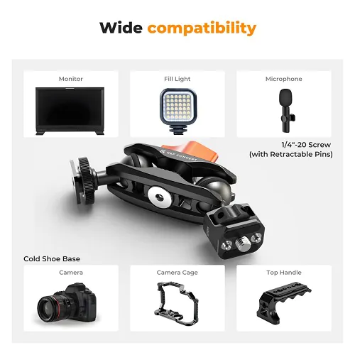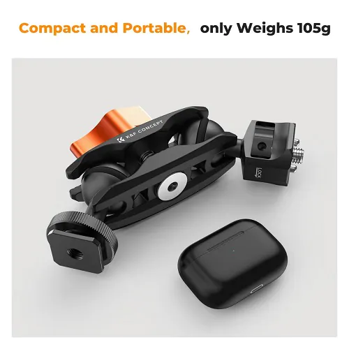 The K&F Concept KF31.098 MS-27 Universal Ballhead Magic Arm with Cold Shoe is a versatile and robust accessory designed to expand the functionality of your camera rig with unmatched flexibility and durability. Featuring a super clamp with a wide 2.3-inch jaw diameter, this K&F Concept KF31.098 MS-27 Magic Arm with Cold Shoe securely attaches to various surfaces while nonslip rubber pads on the clamp ensure a firm grip without damaging your gear. The arm itself is equipped with ARRI-type locating pins and multiple 1/4"-20 mounting holes, providing numerous attachment points for accessories. Its standout feature is the double-head cold shoe magic arm, which supports free rotation at multiple angles, giving you creative freedom to adjust your lighting or shooting setup precisely as needed. The double heads incorporate rubber pads that deliver smooth and stable damping when turning, making locking effortless and providing a seamless, stable operation experience. Included in the package are a GoPro interface clip and a smartphone holder, broadening compatibility with different devices. The ballhead offers 360-degree rotation and tilt capabilities, enabling precise positioning of mounted accessories and minimizing camera shake for steady shots. With a solid load capacity of up to 1.5 kg and constructed from high-quality materials, the K&F Concept KF31.098 MS-27 balances strength, reliability, and versatility, making it an essential tool for photographers and videographers looking to enhance their creative setups by mounting microphones, lights, or other accessories with ease and confidence.