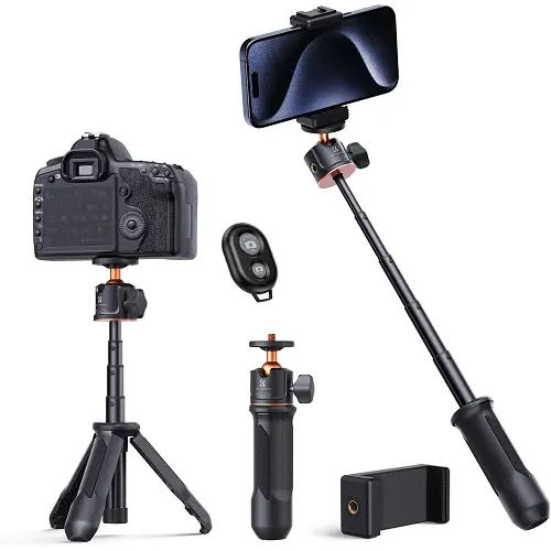 The K&F Concept KF09.128V3 MS-09 Portable Selfie Tripod is a flexible and lightweight tripod ideal for photographers, vloggers, and travelers. It is made of a strong aluminum alloy that provides stability while staying compact enough to be easily portable. With a maximum height of 34cm and a folded length of 15.5cm, this tripod is great for taking selfies, group shots, and films while on the road. The 360-degree ball head rotation, allows users to easily modify angles for the ideal shot. The 180-degree tilt head adds flexibility, allowing you to shoot both landscape and portrait orientations. The K&F Concept MS-09 camera tripod also contains a built-in Bluetooth remote shutter, allowing for hands-free photography from up to 10 meters away. The K&F Concept MS-09 is a video desktop tripod compatible with a wide range of smartphones, as well as action cameras like the GoPro Hero series. Its 1/4-inch universal interface ensures compatibility with various devices, making it a reliable choice for content creators. Designed with a widened fixed structure and a non-slip silicone pad, this tripod provides enhanced stability, even on uneven surfaces. Whether you're capturing travel moments, live streaming, or recording professional content, this mini tripod delivers convenience and reliability. For those looking for a compact, easy-to-use, and feature-rich selfie tripod, the K&F Concept MS-09 professional tripod is an excellent choice. Its combination of portability, durability, and advanced features makes it a must-have accessory for photographers and videographers alike.