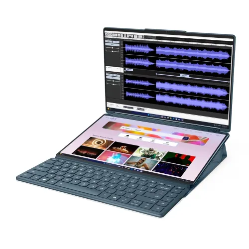 The Lenovo Yoga Book 9 14IAH10 Core Ultra 9 285H Touch Laptop is a groundbreaking dual-screen device designed to deliver unmatched innovation, versatility, and premium performance. Powered by the Intel Core Ultra 9 285H processor (24MB Cache, up to 5.4GHz) with 16 cores (6P + 8E + 2LPE) and Intel AI Boost NPU offering up to 13 TOPS of AI acceleration, this Lenovo Yoga Book 9 14IAH10 Core Ultra 9 Laptop ensures ultra-fast multitasking and intelligent efficiency for professionals and creators. It comes equipped with 32GB LPDDR5x-8400MHz RAM and a 1TB PCIe 4.0x4 NVMe SSD, ensuring lightning-fast data access and ample storage for productivity and entertainment. Featuring dual 14-inch 2.8K WQXGA+ (2880x1800) OLED PureSight touch displays, the Lenovo Yoga Book 9 14IAH10 Touch Laptop delivers stunning visuals with 750 nits peak brightness, 120Hz refresh rate, and 100% DCI-P3 color gamut, along with Dolby Vision, DisplayHDR True Black 600, and Eyesafe certification for immersive, eye-friendly viewing. The sleek Tidal Teal magnesium alloy body, weighing only 1.219 kg, makes it both durable and lightweight. The backlit keyboard, dual touchscreen design, and 5MP IR webcam with E-shutter enhance both productivity and privacy, while four stereo speakers with Dolby Atmos and Smart Amplifier deliver superior sound quality. For connectivity, the Lenovo Yoga Book 9 14IAH10 Core Ultra 9 Touch Laptop offers Wi-Fi 7, Bluetooth 5.4, and three Thunderbolt 4/USB4 40Gbps ports with Power Delivery and DisplayPort 2.1 support. Its 88Wh battery and 65W USB-C slim adapter provide reliable all-day power. Certified with Intel Evo Platform, ENERGY STAR 9.0, EPEAT Gold, and MIL-STD-810H military-grade durability, the Lenovo Yoga Book 9 14IAH10 Core Ultra 9 285H Touch Laptop is the perfect blend of innovation, AI performance, and elegant craftsmanship—ideal for modern users seeking a premium, high-performance dual-screen experience.